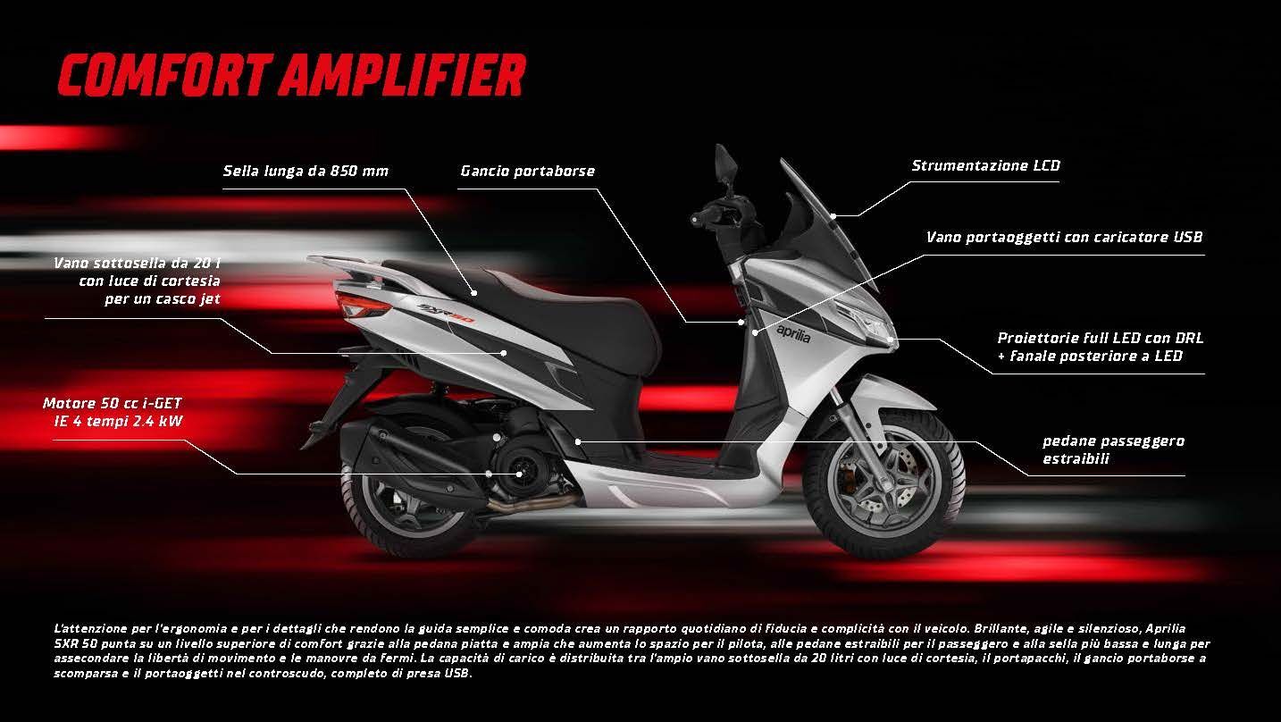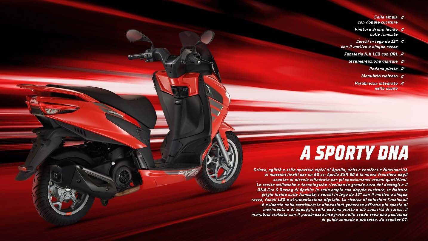 L'Aprilia SXR 50 è il primo scooter urbano di piccola cilindrata che unisce comfort, efficienza nei consumi e il carattere distintivo di Aprilia. Progettato per i giovani, offre agilità, tenuta di strada e un eccellente rapporto qualità-prezzo. Dinamico e funzionale, è il compagno ideale per le sfide quotidiane.
