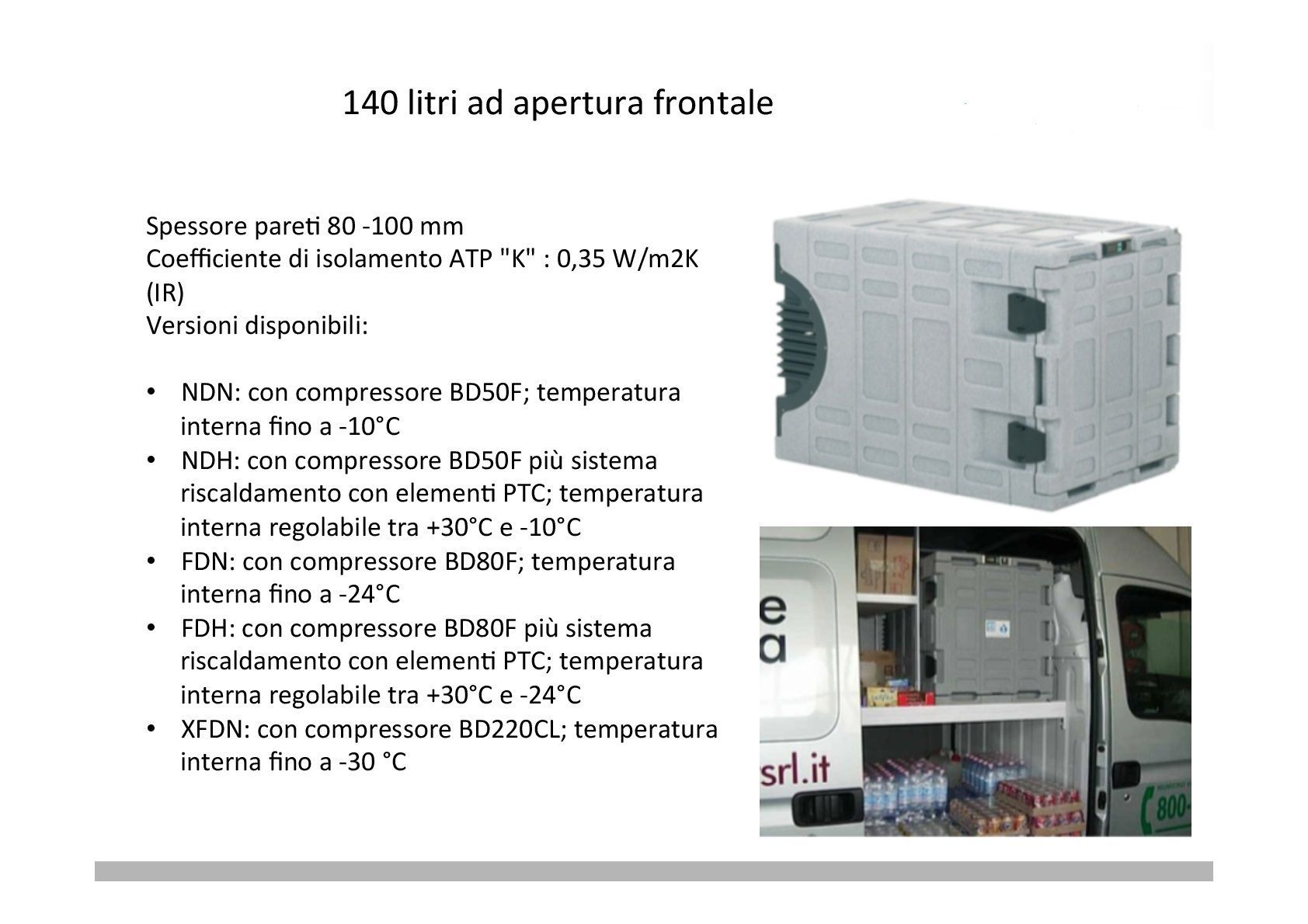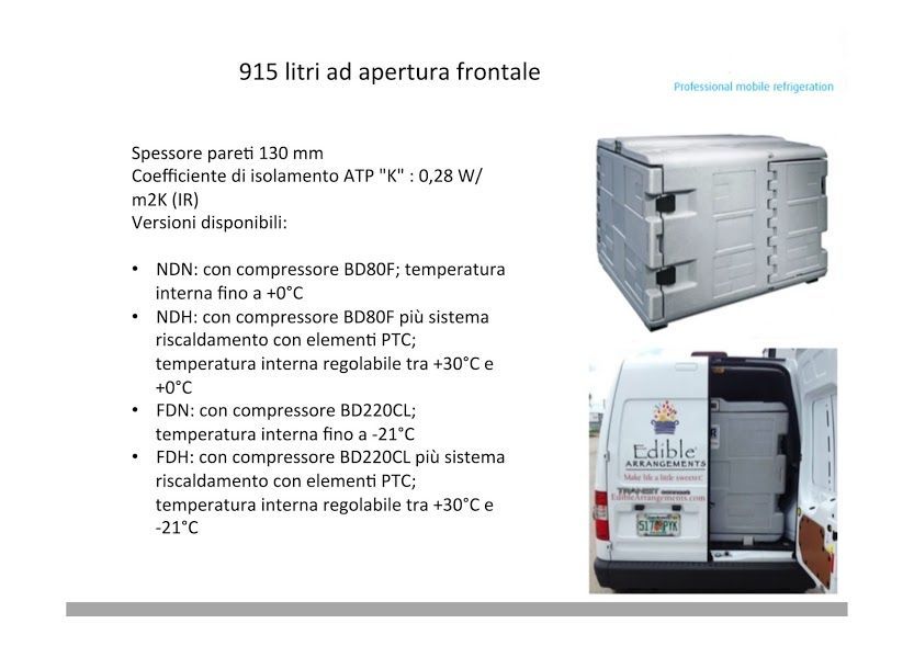 Versioni FDN per il trasporto di prodotti freschi o surgelati. Versioni FDH con sistema automatico caldo/freddo per il trasporto di prodotti farmaceutici e biologici in ogni condizione ambientale. Mantenimento costante della temperatura impostata, con una corretta distribuzione del flusso d’aria all’interno dell’unità, indipendentemente dalla temperatura ambiente, come da disposizioni GDP.