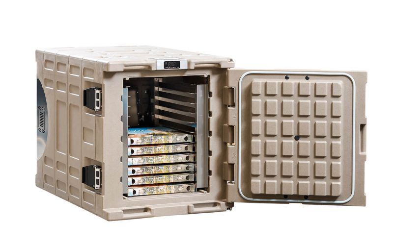 Modello H330 AuO Contenitore ad apertura frontale realizzato in polietilene per alimenti (PE) in unico corpo con stampaggio rotazionale, volume interno lordo 330 litri. Isolamento rinforzato in poliuretano espanso (PU) con coefficiente “K” di 0,27 W/m2K. Sistema riscaldante con moduli PTC a 12V con potenza riscaldante di 450W (12V). Termostato elettronico con display digitale, gamma di regolazione della temperatura da +65°C a +85°C. Modulo HACCP / Bluetooth per la registrazione dei dati di temperatura disponibile come accessorio. Dimensionato per contenitori Gastronorm 2/1, 1/1 e 2/4 (con montanti specifici disponibili come accessorio). Modello con batteria integrata per funzionamento completamente autonomo per 8+ ore. Batteria 12V al gel (VRLA) a scarica lenta. Capacità batteria 110Ah. Carica batteria in dotazione con voltaggio di ingresso 110/230V, capacità di carica 40A, certificazioni CE, UL, CSA.